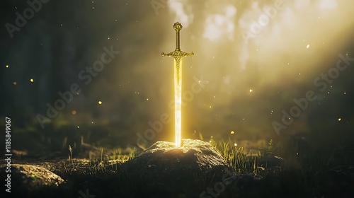 © Wongstorn, Naklejka premium A golden sword is on a rock in a field