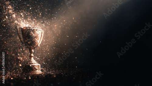 © The Yudel Media, Obraz premium A golden trophy glows dramatically in a dark space as shimmering particles burst around it, creating a cinematic celebration effect.