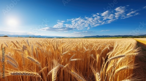 Fototapeta premium A golden wheat field under a bright blue sky with scattered clouds,...