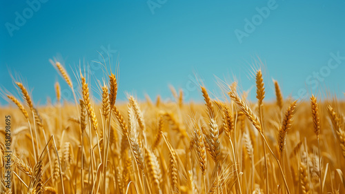 Fototapeta premium A golden wheat field under a deep blue sky, with the stalks swaying gently in...