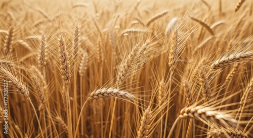Fototapeta premium A golden wheat field with sunlight shining through the ears.