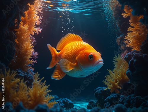 Fototapeta premium A goldfish in the deep waters of the ocean.