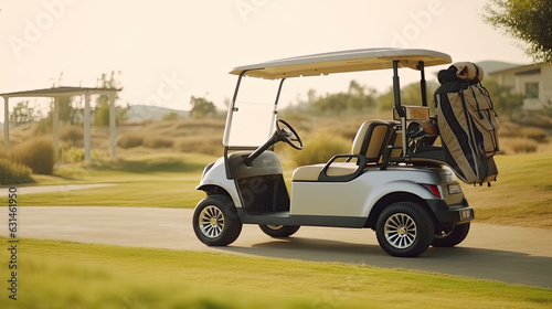 Obraz premium A Golf car, Golf cart or car on golf course. Equipment and bag are put in ready for golfer to player in field. Generative Ai