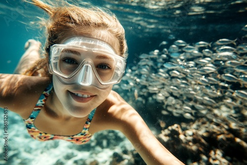 Fototapeta premium A gorgeous and sexy happy young woman with blond hair in a swimming mask and fins snorkeling among the corals. A dense school of silver fish swims next to her. Bright commercial style image.