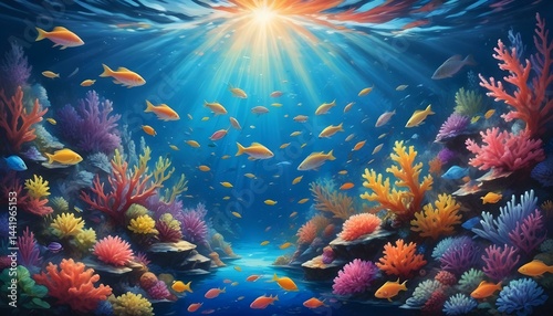 Fototapeta premium A gorgeous depiction of vibrant coral reefs and a school of fish swimming...