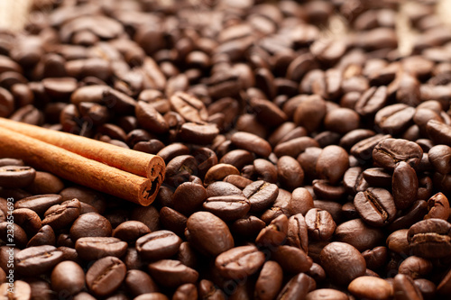 Fototapeta premium A gorgeous stick of natural fragrant brown cinnamon lies on freshly roasted coffee beans in the lower left third of the frame in a golden section. Photo of coffee beans and cinnamon in backlight.
