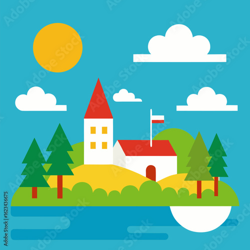 © TahrinAkther, Naklejka premium A gorgeous summer day in Poland's Masuria lake district vector landscape background.
