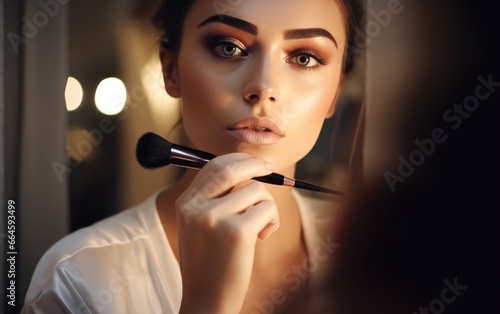 Obraz premium A gorgeous woman applying some makeup in front of a mirror