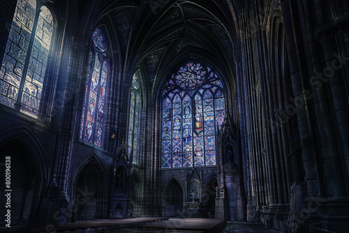 © YouAreBeautiful, Obraz premium A gothic cathedral's dimly lit interior during a thunderstorm