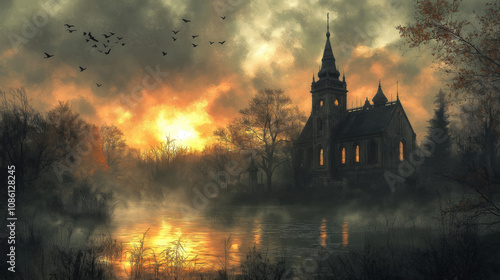 © Abelorz, Fototapeta premium A gothic church stands beside the misty lake, its spire reaching towards an ominous sky filled with dark clouds and silhouettes of birds flying overhead.