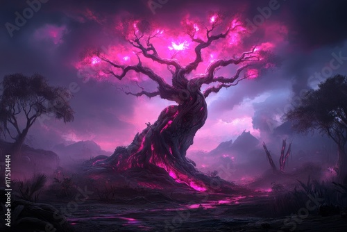 © Thammarong, Obraz premium A gothic depiction of Pandora jungle at night, with shadowy trees and faintly glowing plants creating a mysterious atmosphere