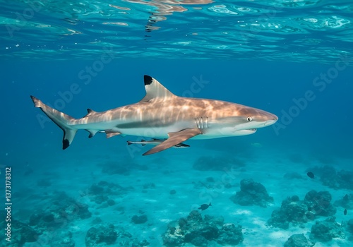 Naklejka premium A graceful blacktip reef shark glides effortlessly through a vibrant coral reef, sunlight dappling its sleek form in the crystal-clear turquoise water.