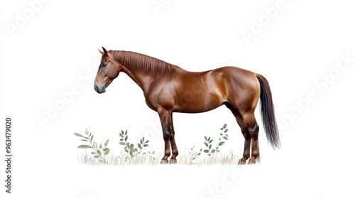 Fototapeta premium A graceful brown horse stands majestically against a pristine white backdrop, showcasing its elegance and strength. The horse is depicted in a tranquil pose, with its head lowered slightly, suggesting