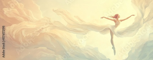 Fototapeta premium A graceful dancer leaps through soft, ethereal clouds, embodying freedom and...