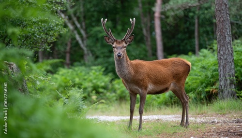 © andyaziz6, Fototapeta premium A graceful deer standing alert in a lush green forest clearing surrounded by tall trees and dense foliage during daytime