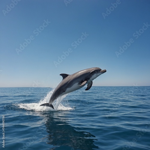 © Noor, Fototapeta premium A graceful dolphin leaping from the ocean in front of a soft blue sky.