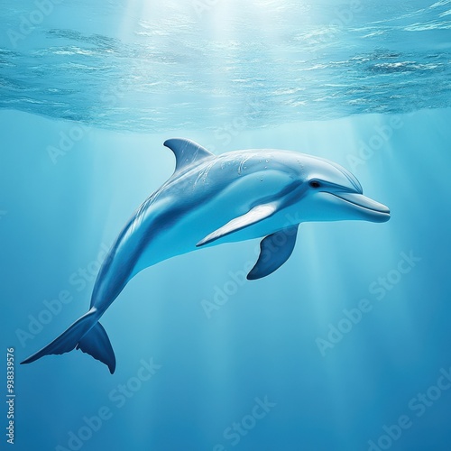 Fototapeta premium A graceful dolphin swimming in clear blue waters, showcasing its agility and beauty in a serene underwater environment.