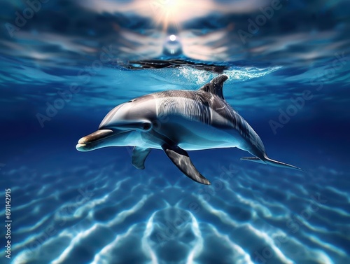 Obraz premium A graceful dolphin swims effortlessly through crystal-clear waters,...