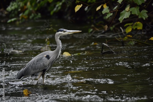 Naklejka premium A graceful grey heron standing still in a shallow river, waiting to catch fish.