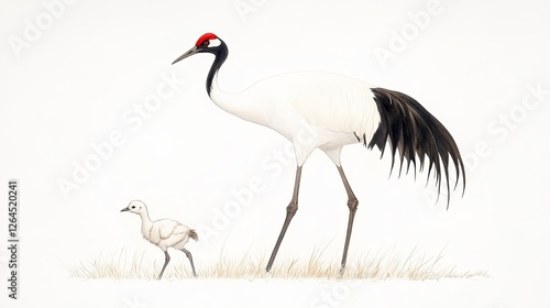 © Vendoz, Obraz premium A graceful red-crowned crane and its chick walking through a serene, grassy landscape