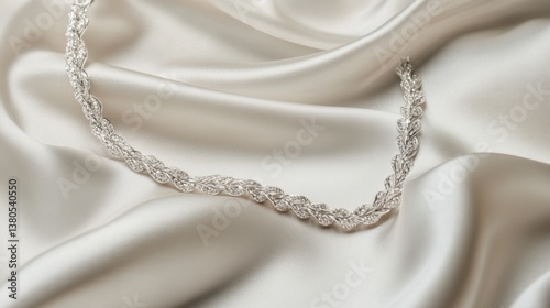 © savittree, Fototapeta premium A graceful silver necklace with a delicate pendant, artfully arranged on a white silk backdrop for a luxurious touch.