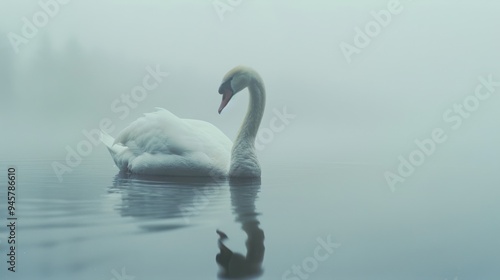 Fototapeta premium A graceful swan gliding across a misty lake, its reflection mirroring the serene and ethereal atmosphere.