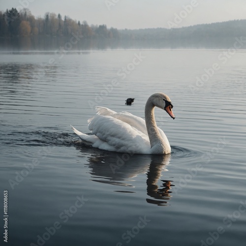 © Hameed, Naklejka premium A graceful swan gliding across a serene lake in a minimalist illustration style