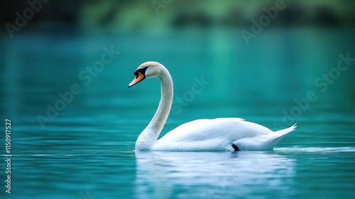 © JUAN_COLLECTION, Obraz premium A graceful swan gliding across a serene turquoise lake.