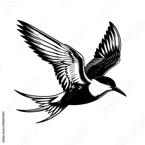 Obraz premium A graceful tern soars through the air with wings spread wide