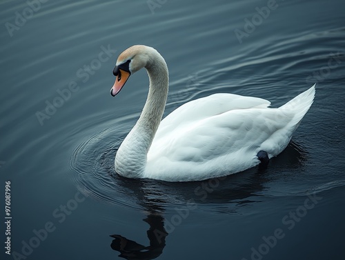 © ChaoticMind, Naklejka premium A graceful white swan floating peacefully on calm blue water, captured in a serene and tranquil moment, embodying purity, beauty, and the gracefulness of nature.