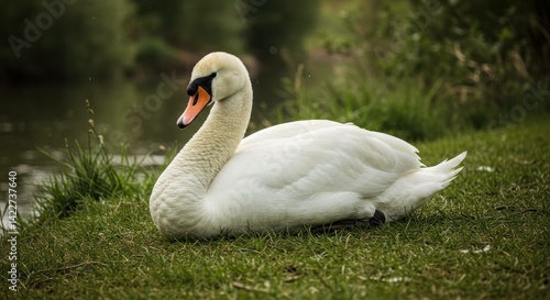 © Tams, Obraz premium A graceful white swan rests on green grass near a tranquil body of water.