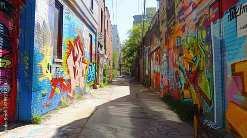 © Art AI Gallery, Fototapeta premium A graffiti covered alleyway with a mural of a man on the wall