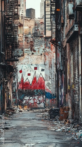© peerasak, Fototapeta premium A graffiti covered alleyway with a red and white mural on the wall. The alleyway is narrow and has a lot of trash on the ground