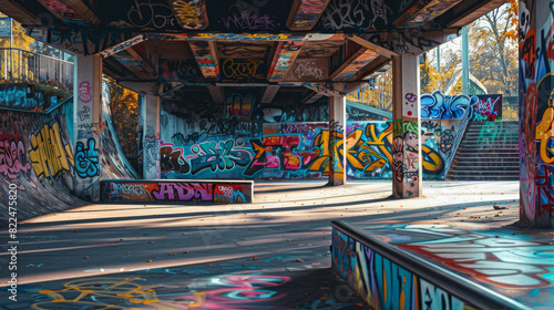 Naklejka premium A graffiti covered skate park with a lot of graffiti on the walls