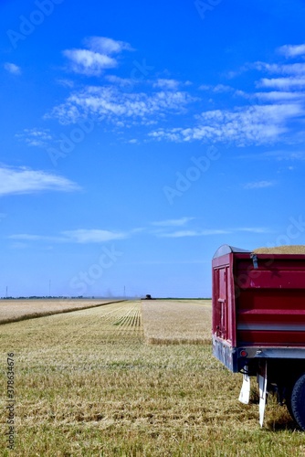 © Murray, Fototapeta premium A grain truck sits in a wheat field waiting to be loaded as a combine approaches