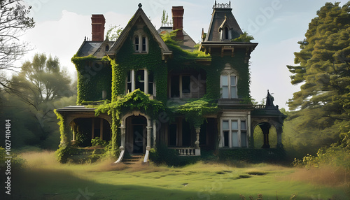 Fototapeta premium A grand, abandoned Victorian mansion, overgrown with ivy, stands silently...