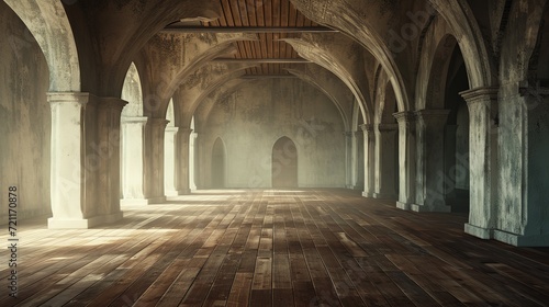 Fototapeta premium A grand, ancient hallway with arched ceilings and wooden flooring, filled...