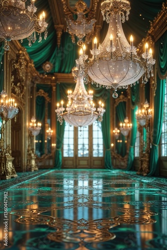 © Ocelia_Mg, Obraz premium A grand ballroom features exquisite chandeliers and lush green drapes. The ornate flooring reflects the intricate design, creating a luxurious atmosphere in this historic venue