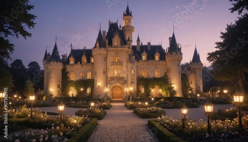 © abu, Naklejka premium A grand castle against the twilight sky, with towering spires and intricate details, illuminated by warm, golden lights, creating a magical, fairy-tale atmosphere.