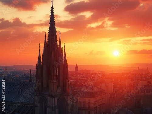 Fototapeta premium A grand cathedral s spires glowing under the setting sun, gothic rooftops...