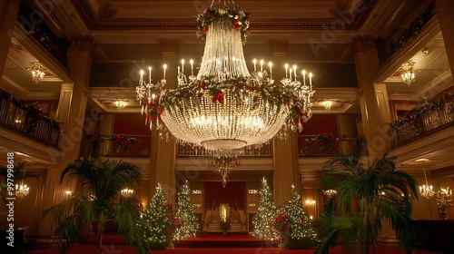© DreamWeaver, Fototapeta premium A grand chandelier adorned with mistletoe and crystal icicles hanging in a grand ballroom