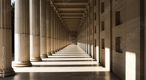 Fototapeta premium A grand colonnade with classical columns casts long shadows on the marble...
