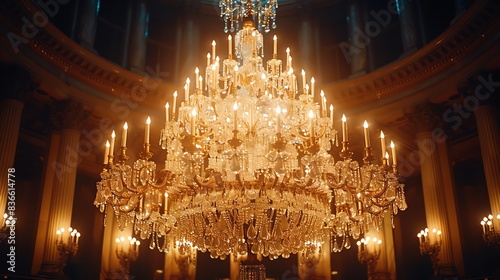 Obraz premium A grand crystal chandelier hangs in a grand room, illuminating the space with...