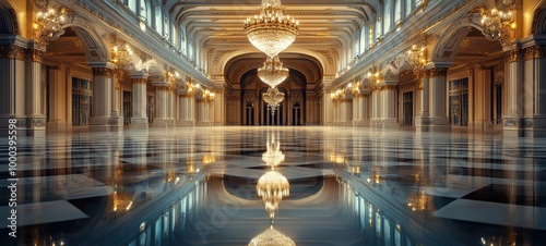 © Ibad, Obraz premium A grand, empty palace hall, with ornate architecture and chandeliers perfectly reflected in polished marble floors