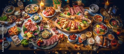 Fototapeta premium a grand feast, a bountiful table laden with an array of delectable dishes, a vibrant tapestry of flavors, intricate culinary creations, a sumptuous spread, a visually stunning tableau, a festive celeb