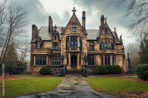 Fototapeta premium A grand, Gothic Revival style mansion with intricate architectural details,...