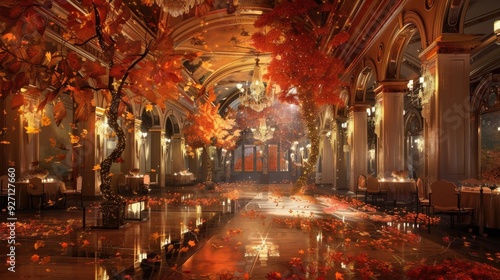 Obraz premium A grand hall with high ceilings and ornate columns is decorated for a wedding reception. The space is filled with a warm glow from chandeliers and candlelight. The tables are set for guests and are ad