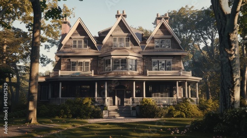 © VK Studio, Fototapeta premium A grand house with multiple gables and a spacious porch, warmly basking in the early morning sunlight, surrounded by trees and well-maintained gardens.