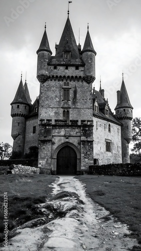 © Adam, Fototapeta premium A grand, imposing stone castle stands sentinel, its weathered towers piercing a somber sky.