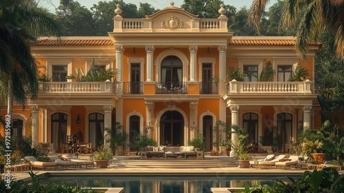 Naklejka premium A grand Mediterranean-style mansion with a swimming pool and lush landscaping